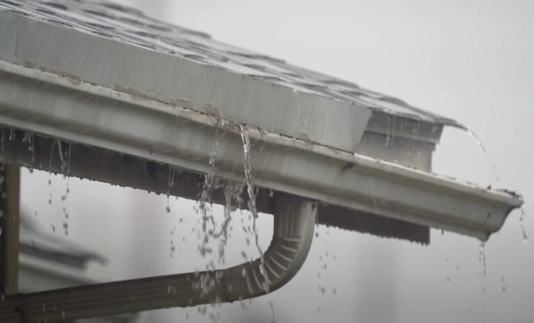 Rainwater cascading down a gray gutter